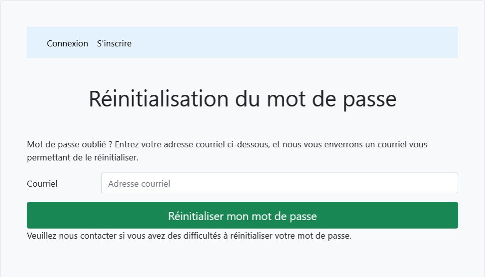 Sur l'écran de connexion, cliquez sur 'Réinitialiser mon mot de passe'. Vous serez redirigé vers une page où vous devrez saisir votre adresse e-mail. Une fois l'e-mail saisi, cliquez sur le bouton vert 'Réinitialiser mon mot de passe'.